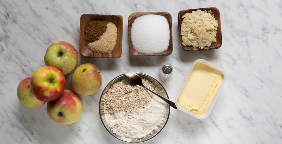 Um die Apfelfüllung herzustellen werden die Äpfel geschält, entkernt und in kleine Würfel geschnitten. Die Apfelstücke werden dann mit dem Zimt und 2 EL Zucker vermischt und in eine Back-/Auflaufform gegeben. Darauf noch etwa die Hälfte der Mandeln streuen und schon kann mit dem Teig für die Streusel begonnen werden (der ist genauso einfach hergestellt wie die Apfelfüllung). Dazu wird einfach das Mehl mit dem Zucker und der Margarine vermengt und dann als Streusel auf den Äpfeln verteilt. Zum Schluss noch den Rest der Mandeln auf den Streuseln verteilen und fertig! Nun kommt der Crumple ab in den Ofen bei 170° Ober-/Unterhitze für ca. 20 min
