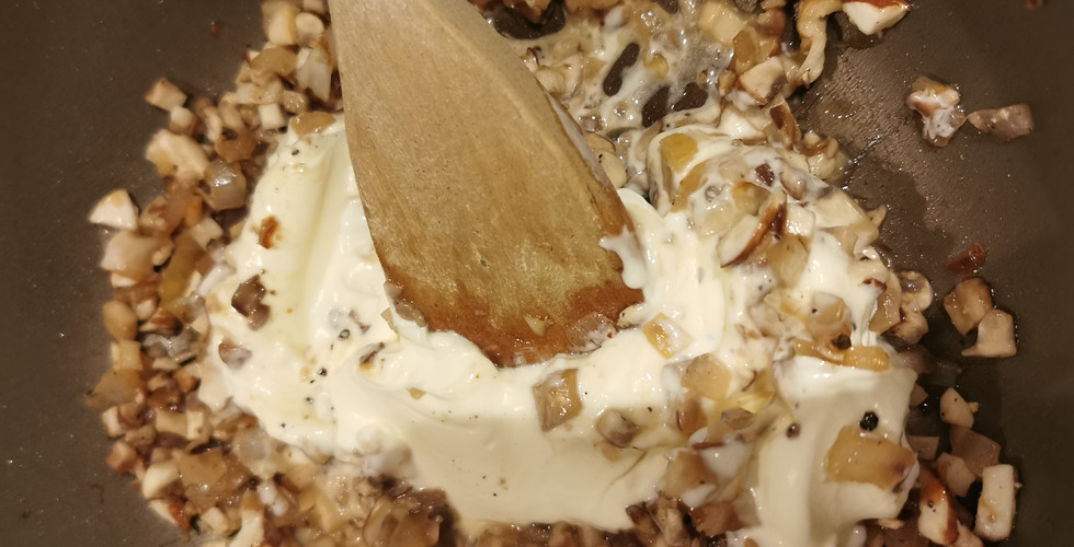 Währenddessen kann bereits die Pilzfüllung zubereitet werden. Dazu werden die Schalotten in feine Würfel geschnitten und mit etwas Öl in einer Pfanne bei mittlerer Hitze angebraten. Die Knoblauchzehe wird geschält und ganz fein gehackt. Auch die Champignons werden in kleine Würfel geschnitten, vorher sollten sie jedoch von Dreckresten befreit werden. Zu den Zwiebeln kommen nun die geschnittenen Champignons, der Knoblauch und eine gute Prise Salz. Wenn die Pilze etwas eingekocht sind kommt der Schmand hinzu und alles wird etwas eingekocht, sodass die Soße etwas fester wird. Das Ganze noch einmal mit Salz & Pfeffer abschmecken und die Füllung für die Nudeln ist fertig. Nun muss sie nur noch etwas abkühlen.