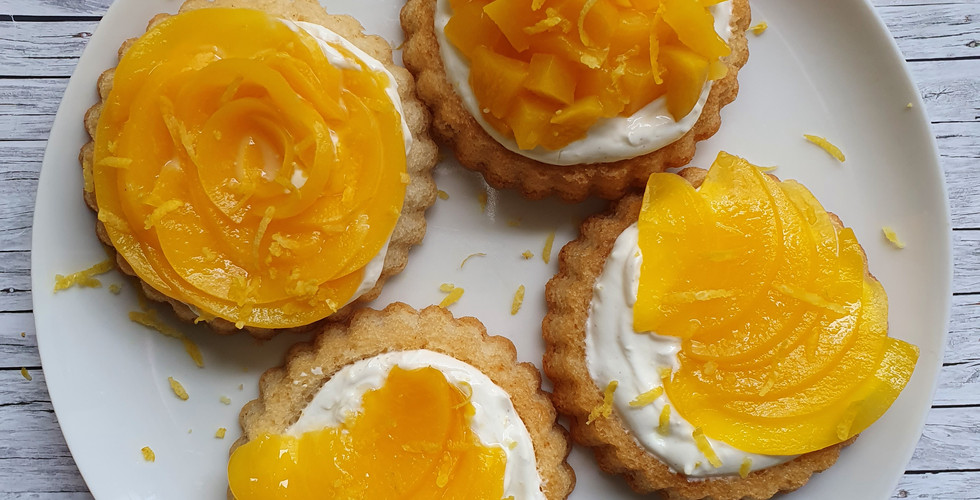 Danach wird der Quark auf den Tartelettes verteilt und mit dem Pfirsich dekoriert.
