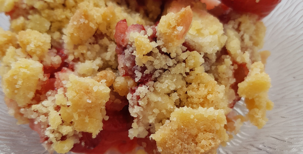 Ein wenig der FlĂŒssigkeit vom Rhabarber in eine kleine SchĂŒssel geben und die StĂ€rke darin auflösen. Diese FlĂŒssigkeit wieder zum Rhabarber geben. Die Erdbeeren können nun auch hinzugegeben werden (falls sie noch nicht aufgetaut sind, einfach fĂŒr ein paar Minuten in die Mikrowelle geben). Alles einmal gut vermischen und schon kann die Rhabarber-Erdbeer FĂŒllung in eine Auflauf- oder Kuchenform gegeben werden. DarĂŒber werden die Streusel gebröselt und der Crumble ist bereit fĂŒr den Ofen.