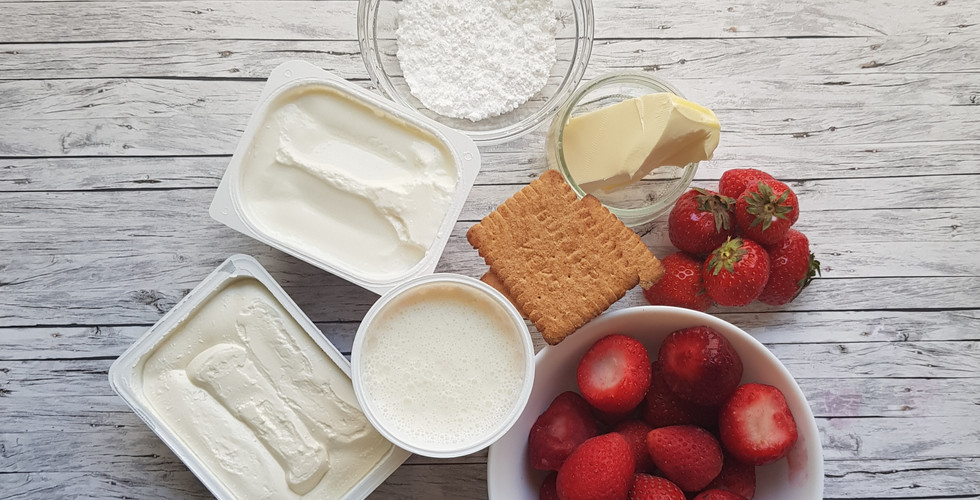FĂŒr die Cheesecake-Creme werden FrischkĂ€se, Quark, Puderzucker und ein Spritzer Zitronensaft miteinander vermischt. In einem zweiten GefÀà wird die Sahne steif geschlagen.
